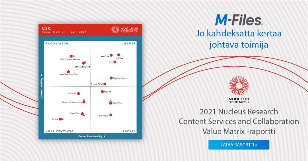 ”M-Files on edelleen markkinoiden johtava toimija muun muassa tietojen yhdistettävyyden ja älykkäiden automaatiotoimintojen ansiosta. M-Files erottautuu muista toimittajista myös tekoälyratkaisujen, metatietopohjaisuuden ja liiketoiminnalle merkittävän tiedon tunnistamisen ansiosta. M-Filesin strateginen tuotekehitystyö kuluneen vuoden aikana vahvistaa M-Filesin johtavaa asemaa”, toteaa Nucleus Researchin pääanalyytikko Barbara Peck.